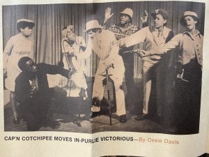 Background: Later this month, my wife, Pat, and I will be traveling to New York City to visit our family and to take in a few plays on Broadway. One of them is a revival of Purlie Victorious, written and performed in the 1960s by Ossie Davis and his wife, Ruby Dee. The play holds special interest for me because I was in a production of it in 1969. I played the only white role, Ol’ Cap’n Cotchipee. Here’s my story: